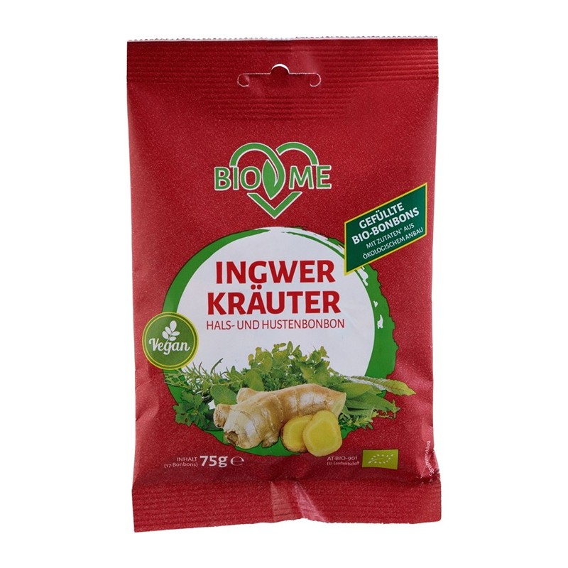 Ingrediente: sirop de glucoză*, zahăr*, acidifiant (acid citric), extract din plante* (0,1%), ghimbir măcinat* (0,04%), aromă naturală de ghimbir*, aromă naturală de lămâie.Bomboane ecologice umplute, cu arome plante: frunze de mur*, rădăcină de pătrunjel de câmp*, albastrele*, gălbenele*, frunze de nalba*, flori de soc*, flori de tei*, frunze de mentă piperată*, ciuboțica cucului*, anason stelat*, frunze de salvie*, fenicul*, patlagină ribwort*, cimbru*, coada soricelului*, rădacina de lemn dulce*, semințe de anason*, flori de mușețel*, ventrilică, rădacină de nalbă mare *. *provin din agricultură ecologică.