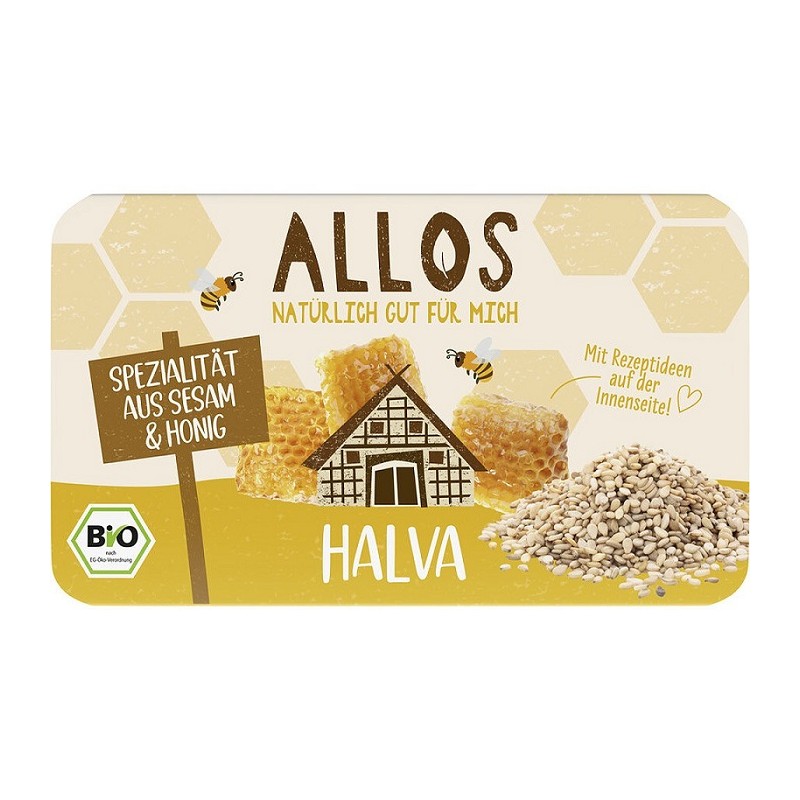 Ingrediente Naturale/Bio. Spre deosebire de halvaua industrială cu zahăr, variantele bio Allos folosesc miere, oferind o opțiune mai sănătoasă și fără arome artificiale.