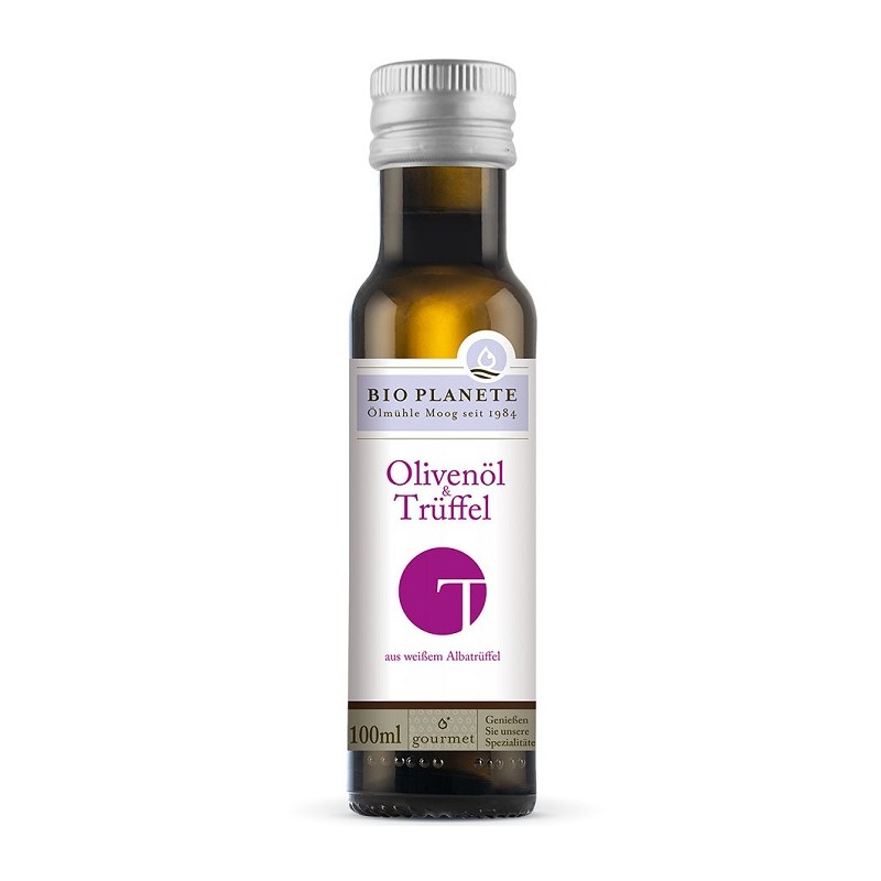 Ulei bio de măsline și trufă Bio Planète. Pentru producerea acestui ulei gourmet fin se utilizează numai trufe Alba, proaspăte si albe. Împreună cu uleiul de măsline italian de înaltă calitate, se adaugă apoi un ulei echilibrat, aromat de trufe. Oferă risotto, paste și cartofi, file de vițel sau carpaccio o notă delicată. Câteva picături sunt suficiente.