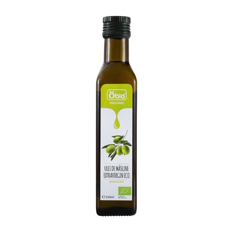 Uleiul de masline bio extravirgin Obio este obtinut din prima presa, prin presarea la rece a maslinelor bio din tara de origine Spania
