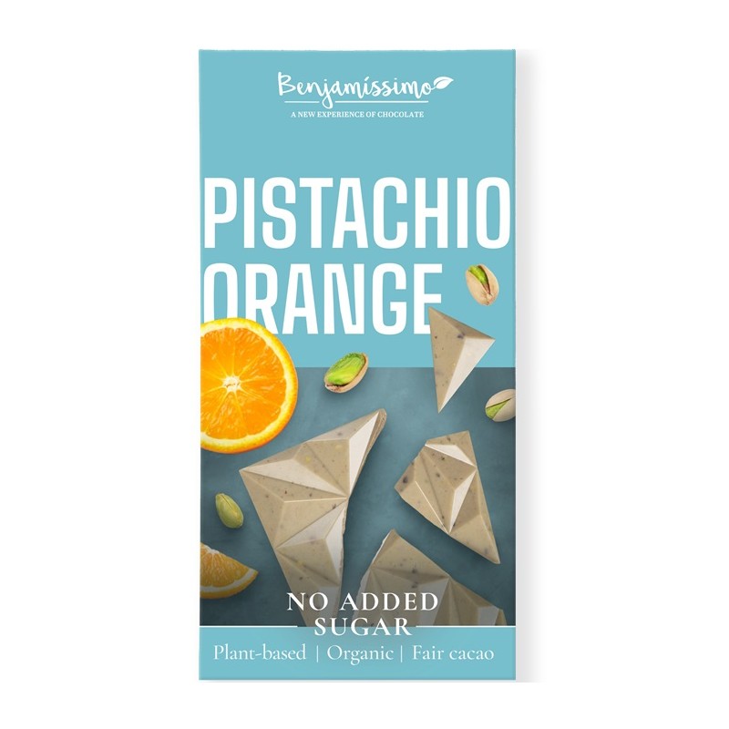 Ciocolata alba cu fistic si portocale bio, fara zahar 60g Benjamissimo
