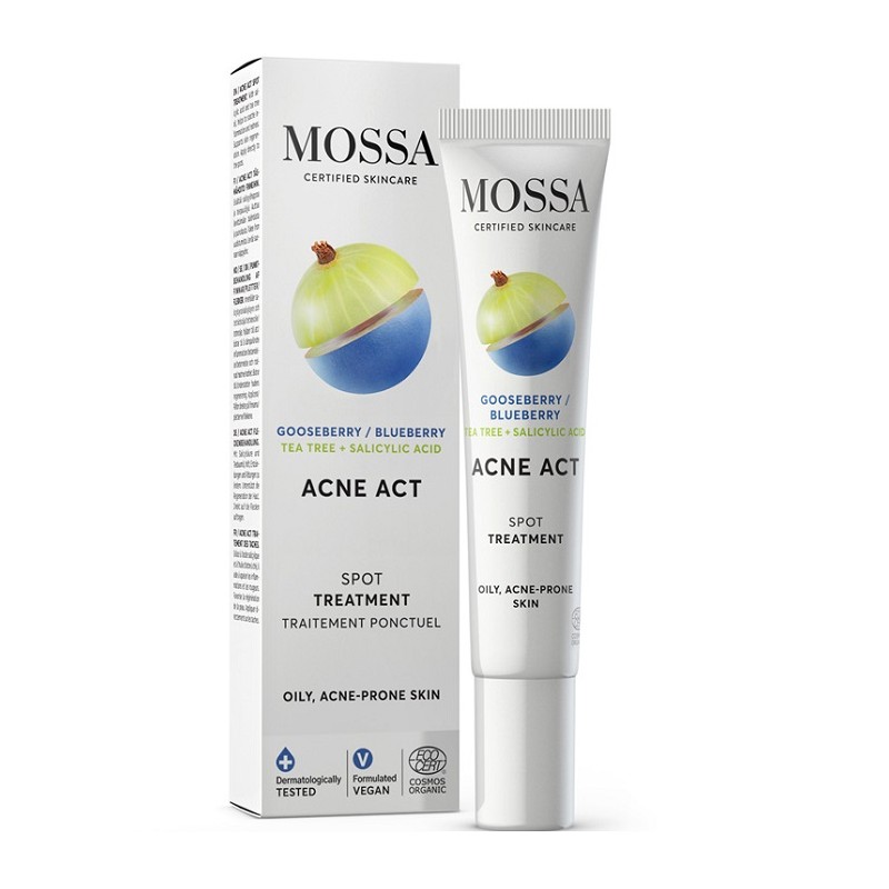 Tratamentul local antiacnee Mossa Acne Act Spot este un produs organic concentrat conceput pentru a acționa rapid asupra coșurilor și imperfecțiunilor individuale. Utilizează o combinație de ingrediente antibacteriene și extracte de fructe de pădure nordice pentru a calma pielea și a accelera vindecarea.
