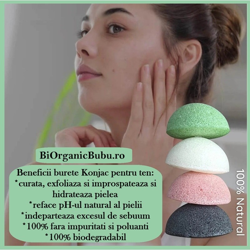 Puteti alege intre mai multe tipuri de burete konjac: cu carbune din bambus pentru ten gras si predispus la acnee, burete cu argila roz pentru ten obosit si deshidratat, burete cu ceai verde pentru ten gras si ten mixt si buretele neutru pentru orice tip de ten pana la cel mai sensibil si delicat.