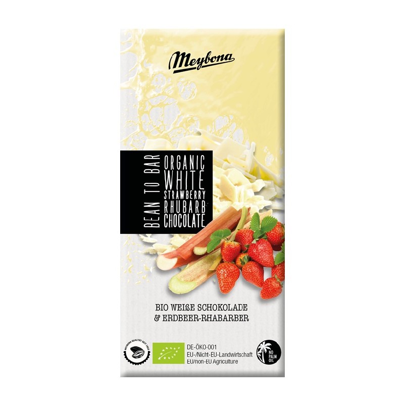Această ciocolată fructată este împodobită cu bucăți delicioase de căpșuni și rubarbă și are un gust pur și simplu divin. Ciocolata albă Meybona este minunat de cremoasă datorită utilizării untului de cacao adevărat. Pentru a completa gustul minunat al ciocolatei gourmet, se adaugă puțină vanilie Bourbon în tableta de ciocolată. După ore întregi de conșare, ciocolata organică își dezvăluie întreaga aroma. Un cadou minunat de dulce sau o gustare delicioasă pentru între mese. Această ciocolată organică fină, făcută din ciocolată albă (35%), provine direct de la fabrica de ciocolată a afacerii de familie Meybona.