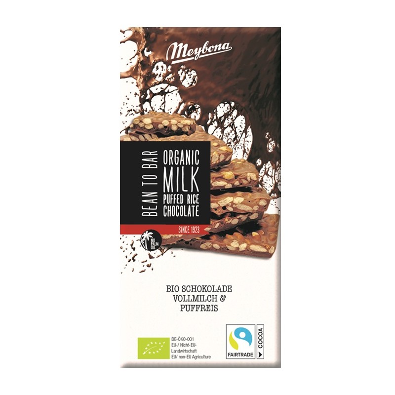 Ciocolata cu lapte organică Meybona cu orez expandat este produsă folosind procesul tradițional de la boabă la baton și reprezintă peste 100 de ani de măiestrie și expertiză. Această ciocolată capătă o notă subtilă de orez datorită orezului expandat și este completată de gustul ușor malțat al zahărului din trestie. Măiestria atentă și dăruirea cu care se produce această ciocolată o transformă într-o experiență culinară incomparabilă pentru iubitorii de ciocolată. Ciocolata organică Meybona este o adevărată sărbătoare pentru palat și, în același timp, o expresie a calității sustenabile și a măiestriei tradiționale.