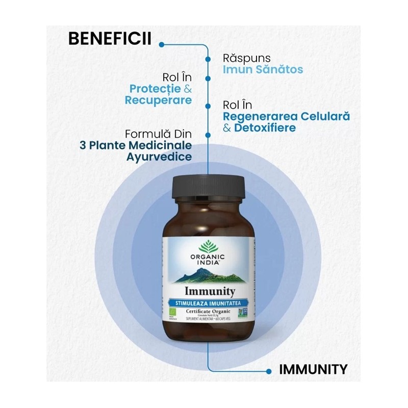 ORGANIC INDIA Immunity, Imunomodulator Natural confera un raspuns imun puternic la infectii, la actiunea radicalilor liberi, a toxinelor si a stresului. Stimuleaza functiile sistemului imunitar, revitalizeaza organismul si sustine procesele naturale de detoxifiere. Bogat in antioxidanti, ORGANIC INDIA Immunity, Imunomodulator Natural combate stresul, sustine functiile ficatului si intareste sistemul imunitar.