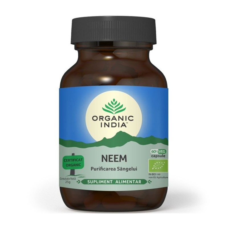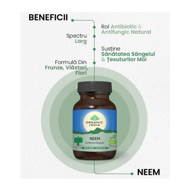 ORGANIC INDIA Neem, Antibiotic Natural sprijina sistemele organismului, curata si purifica sangele, este benefic pentru detoxifierea organismului, sustine sistemul imunitar si sanatatea pielii, contribuie la echilibrarea digestiei si a metabolismului si la mentinerea unui nivel sanatos al glucidelor din sange.