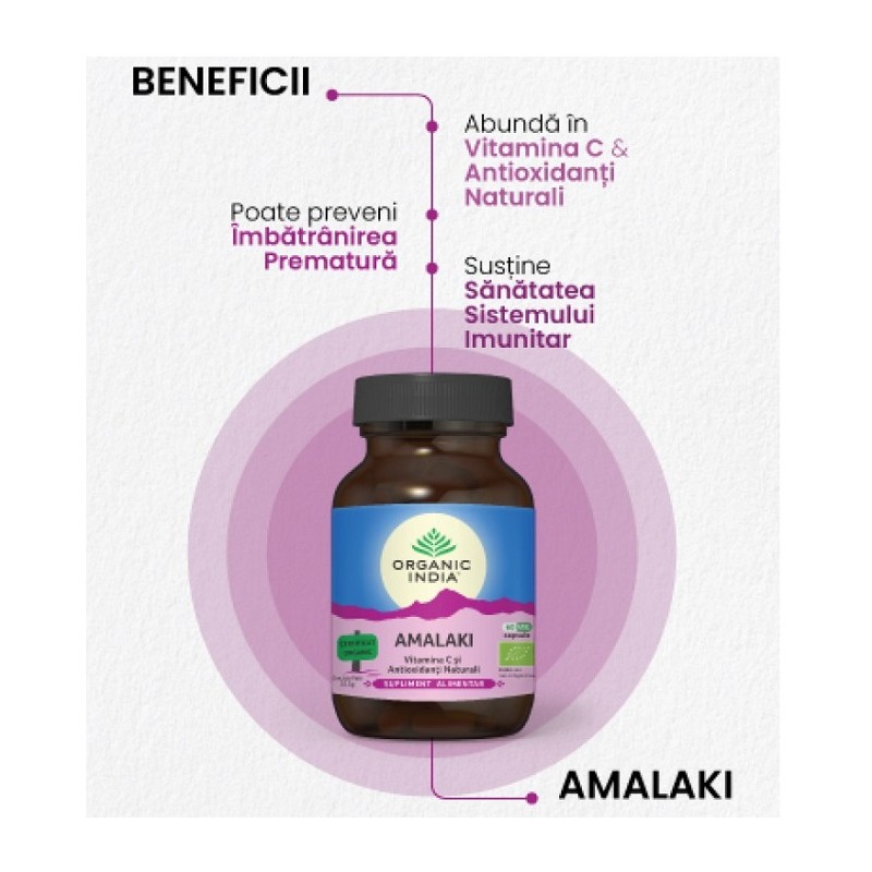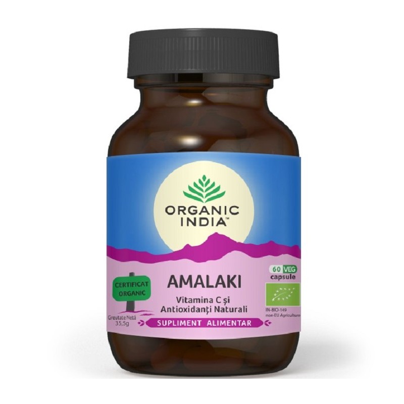 ORGANIC INDIA Amalaki, Vitamina C & Antioxidanti confera o sursa integral bio-disponibila de antioxidanti si Vitamina C naturala care este usor digerata si asimilata. Provine din una dintre principalele surse naturale de Vitamina C, fructul de Amla. Amalaki sustine sanatatea sistemului digestiv si a tractului gastrointestinal si sprijina digestia. Amalaki abunda in antioxidanti naturali care contribuie la reducerea radicalilor liberi si la stimularea raspunsului imun. Amalaki contribuie la neutralizarea toxinelor si sprijina sanatatea sistemelor urinar si reproducator. Testele de laborator confirma faptul ca Amalaki are o actiune antioxidanta de peste 5 ori mai puternica decat spirulina*.