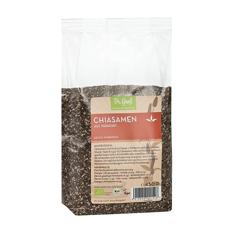 Semințe bio de chia Dr. GroB, bogate în fibre și Omega-3, ideale pentru smoothie-uri, deserturi și un stil de viață sănătos. Se pot consuma crude sau hidratate, în budinci, smoothie-uri, iaurturi, cereale sau ca agent de legare în rețete vegane. Datorită capacității lor de absorbție, oferă o textură gelatinoasă și sățioasă, susținând digestia și nivelul de energie pe termen lung.