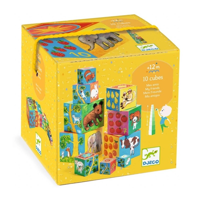 Format din 10 blocuri din carton gros care să se potrivească, să se clădească și să se doboare de câte ori doriți! Copiii stivuiesc cuburile astfel încât ilustrațiile să creeze o secvență logică. Învăța astfel forme, culori, animale și cifre, își deszvoltă abilităţile motorice și aproximează mărimile.
