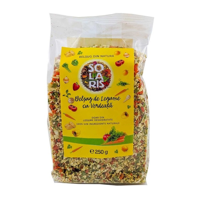 Am selectat cu grijă pentru tine gust bogat de legume sănătoase ca să te poți bucura împreună cu cei dragi de un gust deosebit al mâncărurilor preparate cu mirodeniile Solaris. Nu conțin aditivi sau conservanți. Poate fi folosit în ciorbe, tocănițe, pentru gustul veritabil al legumelor.