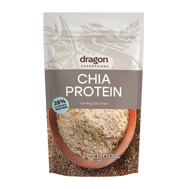 Pudra proteica din seminte de chia Dragon Superfoods Bio este obtinuta dupa ce semintele de chia sunt presate pentru a stoarce uleiul de chia. Contine toti aminoacizii, antioxidanti, fibre, calciu, vitamina B1. Pudra proteica din seminte de chia este ideala pentru a fi folosita in smoothies, granola, patiserie (in briose), shake-uri.
