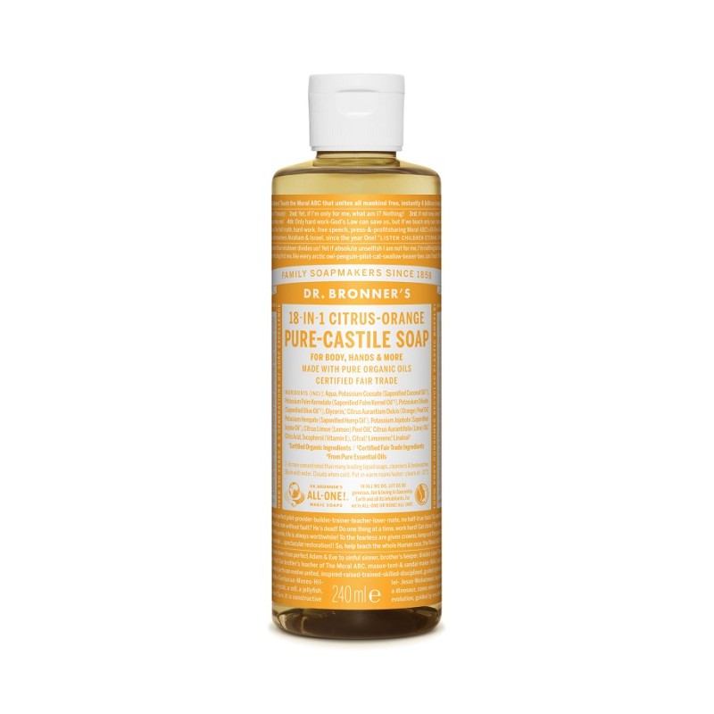 Sapun lichid de Castilia Dr Bronner cu aroma de citrice: unica, revigoranta, proaspata. Mirosul de ulei organic de citrice inconfundabil! Dr Bronner a combinat ulei organic de portocala, lamaie si lime intr-o experienta unica.