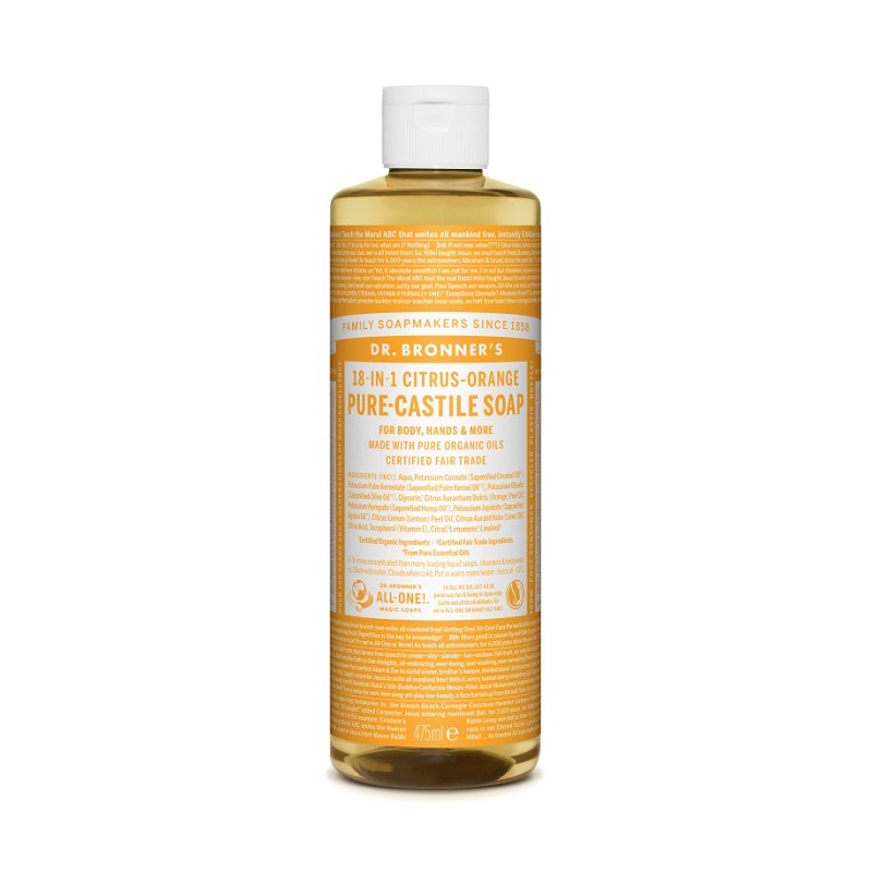 Sapun lichid de Castilia Dr Bronner cu aroma de citrice: unica, revigoranta, proaspata. Mirosul de ulei organic de citrice inconfundabil! Dr Bronner a combinat ulei organic de portocala, lamaie si lime intr-o experienta unica.