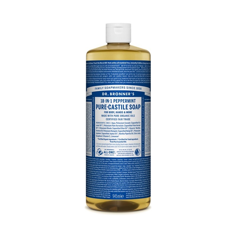Sapun lichid de Castilia Dr Bronner ideal pentru fata, corp, par. Utilizat in gospodarie pentru spalarea vaselor, a hainelor, a mancarii, precum si pentru curatarea podelelor. Poate fi folosit pentru indepartarea insectelor de pe plante, a capuselor sau insecticid impotriva furnicilor