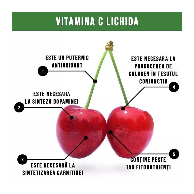 Vitamina C lichida BIO inglobeaza efectele binefacatoare ale Acerolei (Visina de Barbados), contine peste 150 de fitonutrienti, printre care si bioflavonoidele.