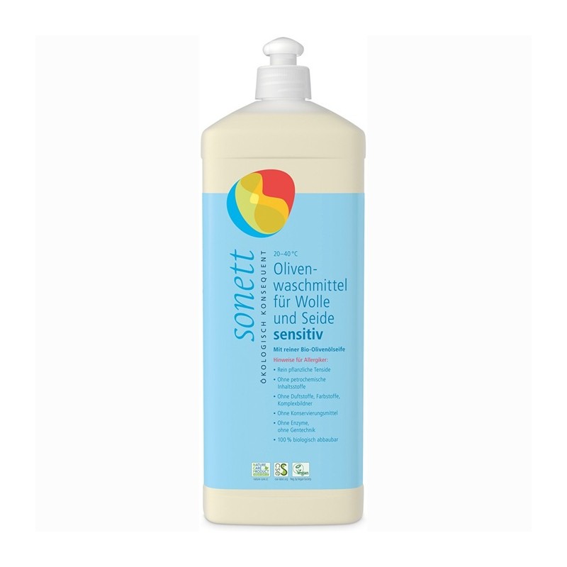 Sonett prelucrează un ulei prețios de măsline pentru a putea obține acest detergent fără parfum pentru alergici. Acest detergent este ideal pentru textile din lână și mătase pe care le curăță, le îngrijește și îndepărtează eficient petele de grăsime. Cu ajutorul surfactanților din zahăr se obține un detergent pe baza de săpun ce poate fi folosit și la un nivel ridicat de duritate a apei, detergentul păstrandu-și toate calitățile. Atât uleiul de măsline cât și cel de rapiță sau de floarea-soarelui provin din 100% agricultură ecologică.