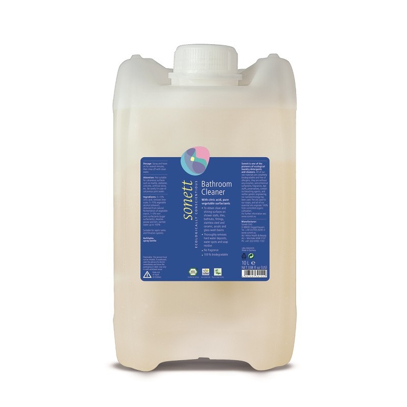 Detergent ecologic Sonett eficient pentru curatat toate suprafetele din baie: cabina de dus, cada, gresia, faianta, obiecte sanitare din inox, fitinguri, etc. Atentie, a nu se folosi pe suprafete calcaroase precum marmura, piatra artificiala, tarrazzo etc.
