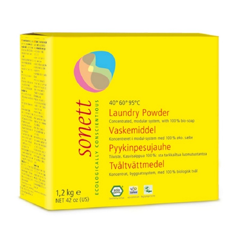 Detergent bio Sonett suficient pentru aproximativ 26 de spalari, potrivit pentru haine din bumbac, in, canepa, si mixturi de tesaturi. Ingredientul principal al acestui detergent este sapunul vegetal pur. Spala la temperaturi cuprinse intre 40 si 95 °C. Nu se recomanda pentru lana, matase, si microfibre.