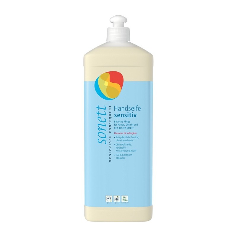 Sonett sapun lichid ecologic neutru fara parfum sau uleiuri esentiale, pentru maini, fata si corp, delicat cu pielea. Ideal de folosit de catre intreaga familie, dar si de catre restaurante, cafenele, hoteluri, scoli, gradinite si alte asemenea locuri unde sapunurile solide sunt interzise. Poate fi folosit in dispensere pe perete. Uleiurile si uleiurile esentiale sunt 100% bio, iar uleiul de cocos folosit in compozitie provine dintr-un proiect Fair Trade din Republica Dominicana. Uleiul de masline provine din cooperative agricole din Spania, Italia, si Grecia.