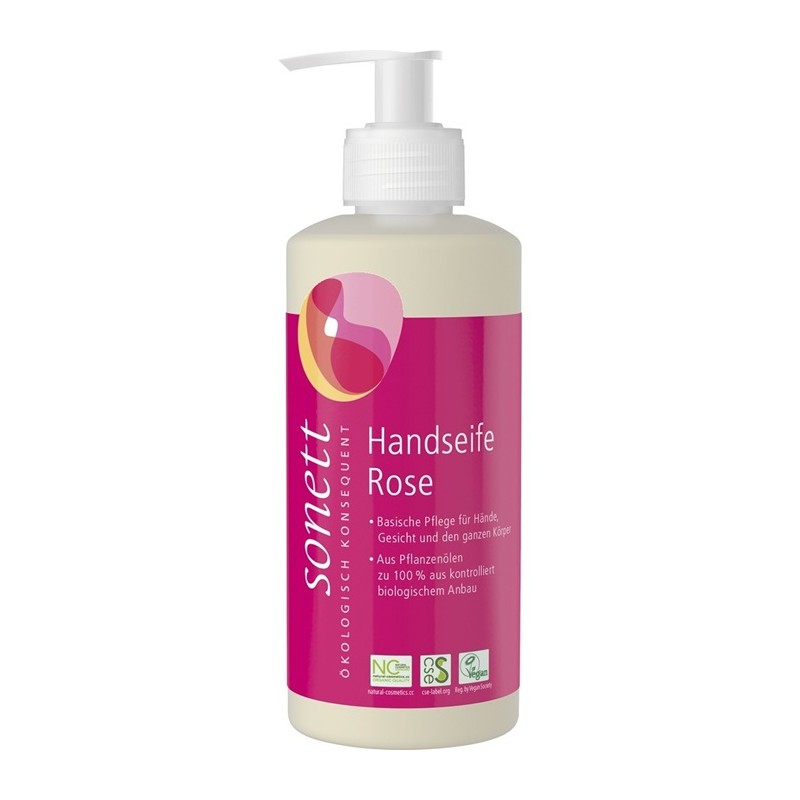 Sapun lichid ecologic Sonett cu apa de trandafir de Damasc, pentru maini, fata si corp, delicat cu pielea. Ideal de folosit de catre intreaga familie, dar si de catre restaurante, cafenele, hoteluri, scoli, gradinite si alte asemenea locuri unde sapunurile solide sunt interzise. Poate fi folosit in dispensere pe perete. Uleiurile si uleiurile esentiale sunt 100% bio, iar uleiul de cocos folosit in compozitie provine dintr-un proiect Fair Trade din Republica Dominicana. Uleiul de masline provine din cooperative agricole din Spania, Italia, si Grecia.