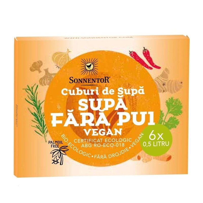Supa de pui este o alternativă excepțională în cazuri tot mai dese de răceli și gripe, acum fiind la îndemăna tuturor prepararea unei supe de pui "fără pui", o variantă Vegan folosind mirodenii în loc de pui. Cuburile conțin mirodenii cu proprietăți încălzitoare și anti-inflamatorii, fiind dovedite deja proprietățiile acestora în studiile și literatura de specialitate, cum ar fi: turmeric, chili, rozmarin sau ghimbir. Un gust corpolent, alternativă sănătoasă de la SONNENTOR la bazele de mâncăruri pline de E-uri și chmicale.