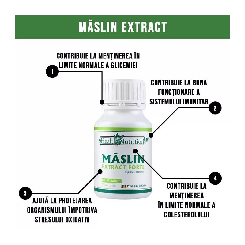 Maslinul Extract Forte face parte din categoria de tratamente naturiste recomandate pentru tratarea mai multor afectiuni. Acesta asociaza efectul antiinfectios si reglator al metabolismului, al extractului pur de frunze de maslin, cu actiunea imunostimulenta a radacinii de Astragalus. Rezultatul este un produs extrem de eficient in caz de infectii gripale, ca adjuvant in infectii bacteriene sau fungice. Extractul de maslin reduce puternic glicemia, colesterolul, trigliceridele din sange. Regleaza tensiunea arteriala si previne depunerile de grasimi pe vasele de sange. Totusi, cea mai spectaculoasa ramane actiunea sa in tratarea infectiilor, inca foarte putin cunoscuta, dar extrem de intensa, in cazul infectiilor herpetice, virusilor hepatici, gripali etc. Healthutrition va pune la dispozitie remedii naturiste create dupa retetele biologilor romani.