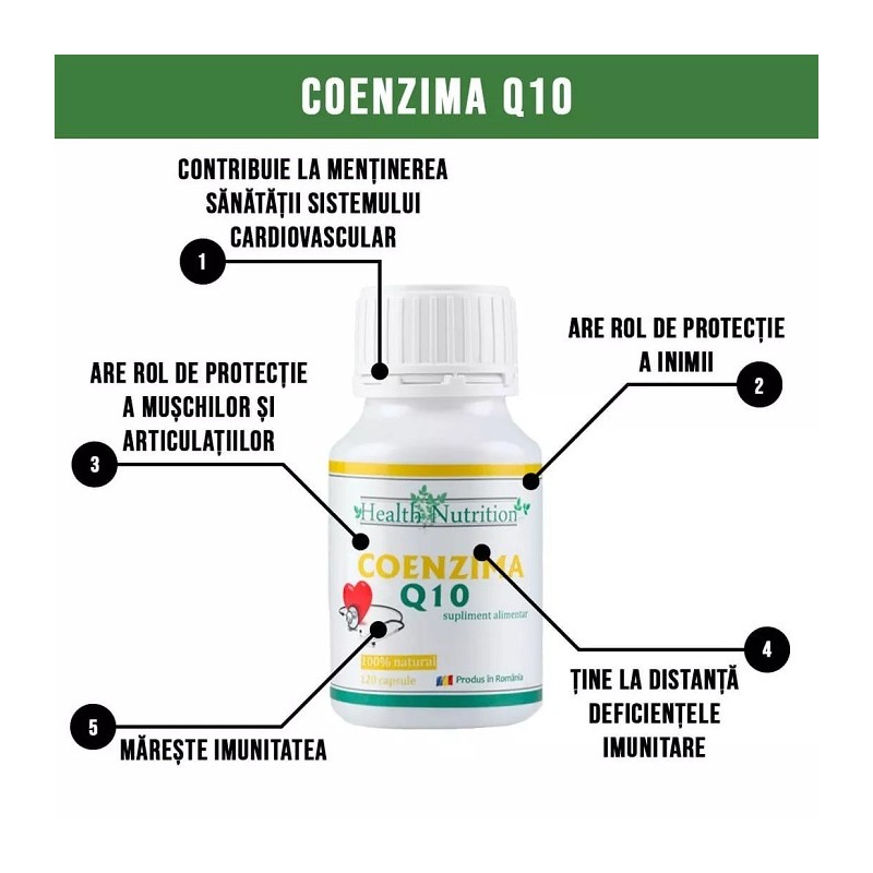 Coenzima Q10, disponibilă în gama de produse naturiste Health Nutrition, este o substanță 100% naturală, asemănătoare unei vitamine, care se regăsește în fiecare celulă a corpului omenesc. Are rol de protecție a inimii, a mușchilor și a articulațiilor, mărește imunitatea, ține la distanță deficiențele imunitare și bolile degenerative ale creierului. În plus, este un adjuvant ce susține energetic toate funcţiile vitale ale organismului.