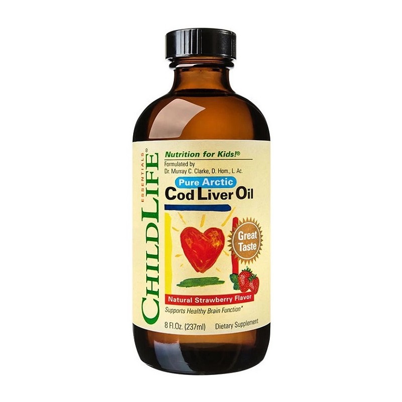 Supliment alimentar pentru copii Cod Liver Oil Childlife Essentials cu gust de capsune sursa de Omega 3 din ulei purificat din ficat de cod ce contribuie la mentinerea functiei normale a creierului si a sistemului osos al copilului.