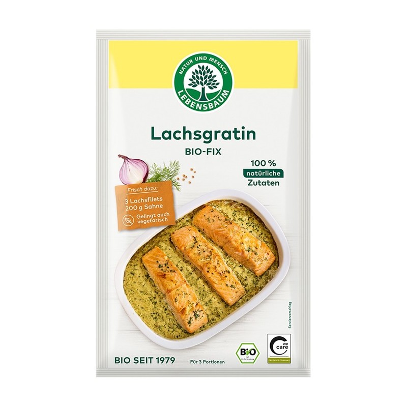 Amestec de condimente Lebensbaum pentru gratinat somon. Ceva special, dar rapid? Ce zici de un somon gratinat? Amestecul de condimente cu ceapă roșie prăjită și muștar necesită doar somon și smântână. Și, desigur, este inclusă și minunata notă de mărar.
