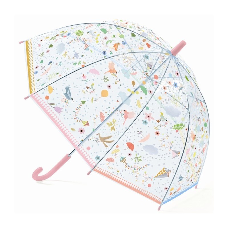 O umbrelă ilustrată în culori delicate. Designul său transparent îi permite copilului să vadă pe unde merge, iar deschiderea manuală prevăzută cu un sistem de protecție înseamnă că poate fi deschisă și închisă fără să ciupească degetele. Un accesoriu colorat, ideal pentru a însenina ieșirile pe ploaie!
