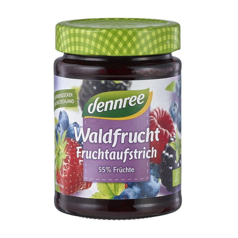 Ingrediente: fructe* 55% (capsuni*, afine*, mure*, zmeura*), zahar* 38%, suc de lamaie*, gelifiant: pectina de mere*. *din agricultura ecologica