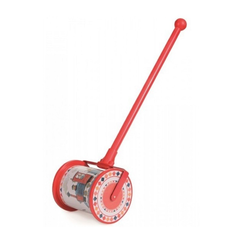 Jucărie de împins. Rola ilustrată se rotește atunci când jucăria este împinsă, și o melodie delicată însoțește primele plimbări ale celui mic.