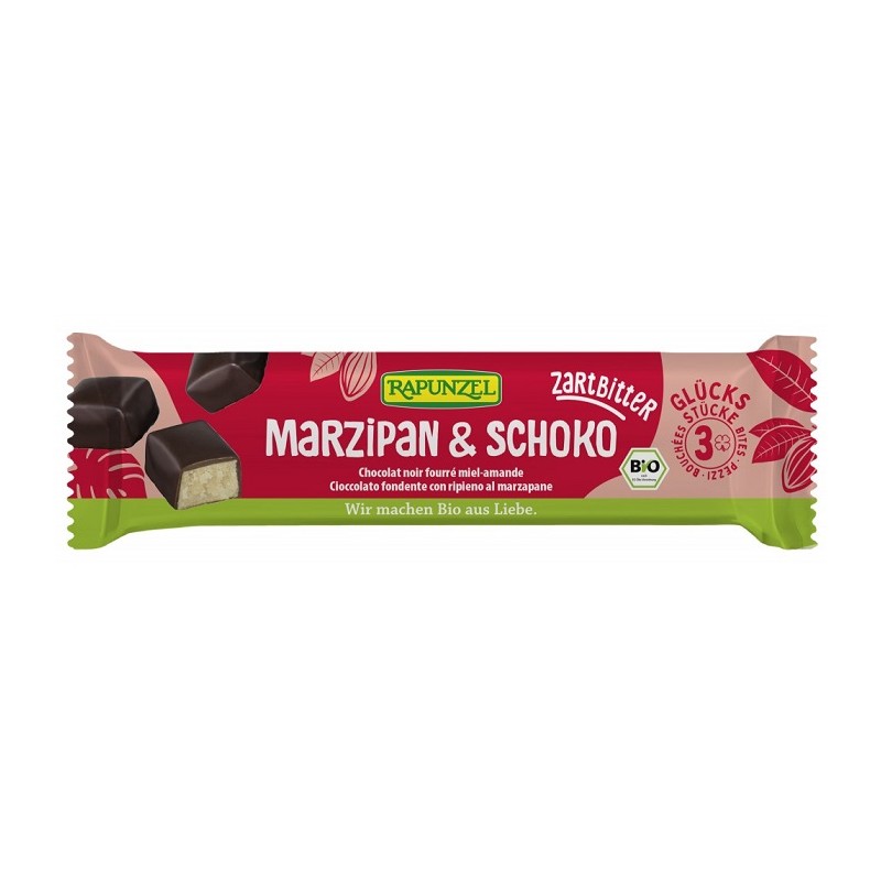 Martipanul bio Rapunzel e ste compus, în esență, din doar două ingrediente: migdale măcinate și miere. Are o textură fină și o aromă autentică de migdale, combinată cu dulceața naturală a mierii. Mierea delicată de flori, combinată cu migdale mărunțite, conferă marțipanului Rapunzel gustul său aromatic special. Marțipanul este tăiat în bucăți mici, acoperite cu ciocolată amaruie care se topește ușor.