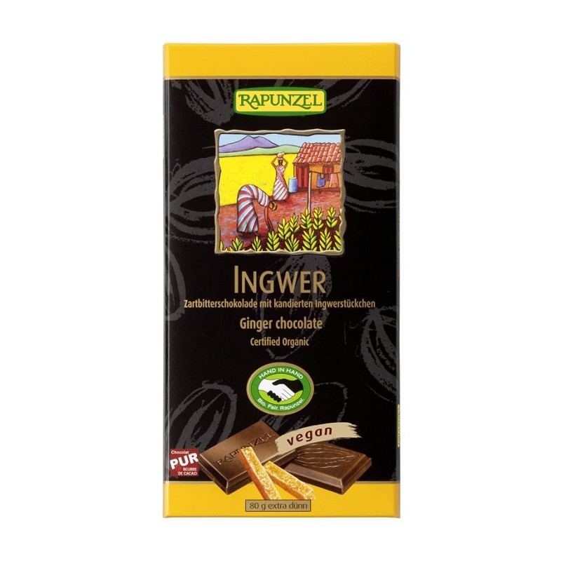Ciocolata amaruie cu ghimbir Rapunzel este o ciocolată organica fină cu bucăţele de ghimbir zaharate şi tocate ceea ce îi conferă o aromă caldă, uşor iute şi intensă. Rapunzel produce ciocolata după cele mai înalte standarde de calitate, conform unei rețete tradiționale din Elveția, folosind ingrediente ce provin din agricultură ecologică.