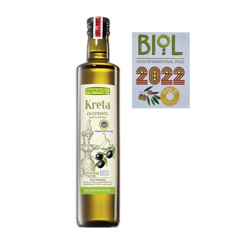 PRODUS DUBLU PREMIAT!!! Ulei de masline bio extravirgin Rapunzel din Creta PDO a convins la concursul BIOL din Italia care l-a recompensat cu AUR DUBLU suplimentar. Un juriu format din 42 de experți a testat peste 500 dintre cele mai bune uleiuri organice din 18 țări și le-a evaluat conform unor reguli stricte.