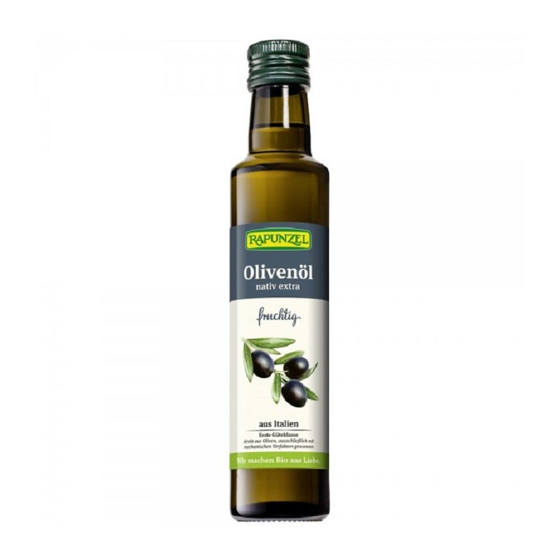 Uleiul de măsline se obține din fructele măslinului (Olea europaea). Măslinele recoltate pentru Uleiul de măsline Rapunzel sunt aduse imediat după recoltă în fabrică și sunt presate, în acest fel se poate ține la un nivel cât de redus posibil conținutul de acizi grași. Acesta determină, pe lângă sortimentul de măsline, clima și momentul recoltei, calitatea uleiului. Măslinele bio ajunse în fabrică sunt mai întâi spălate după care tocate, presate și ulterior centrifugate. Astfel uleiul se separă de apa lăsată de măsline. Uleiul de măsline Rapunzel provine din regiunile de măslini tradiționale din Italia, cum ar fi Sicilia, Calabria și Apulia.