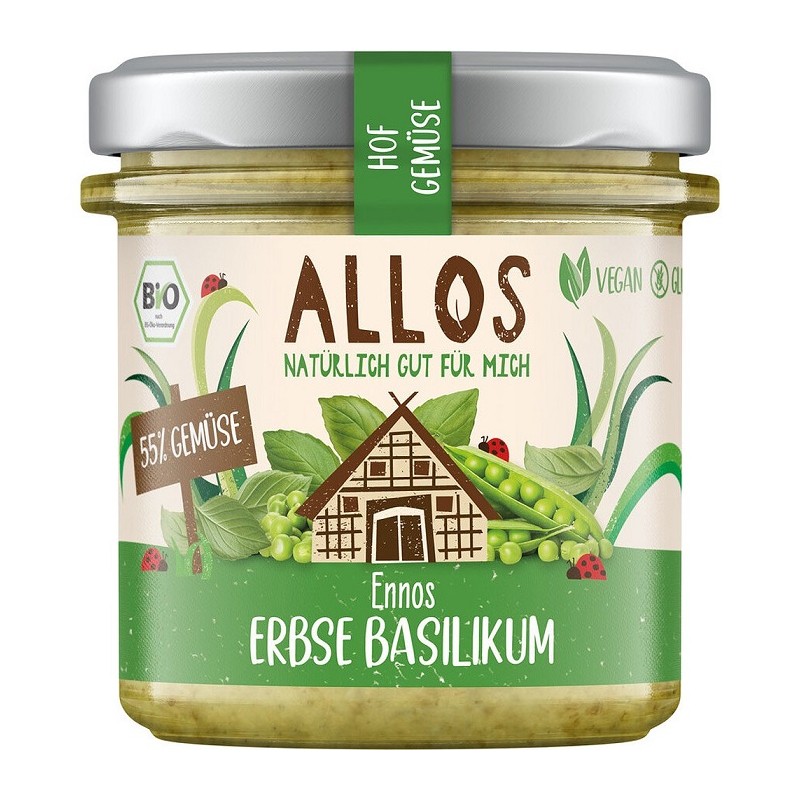 Crema tartinabila Allos va ofera o plăcere 100% vegetariană, vegană, fără gluten – doar bucati intregi din legume de ferma. Bucurati-va de o mare varietate de sortimente delicioase de creme tartinabile vegetale Allos. Acest produs conține 65% legume, amestec de mazăre și busuioc are un gust proaspat incomparabil. Gustul natural este rafinat de o notă de mentă și o ușoară condimentare cu ardei iute.